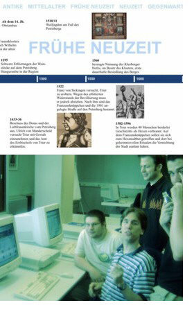 Bei unserem Medien-Projekt "Perspektive Petrisberg" haben wir Medienwissenschafts-Studenten der Uni Trier die Landesgartenschau Trier begleitet und dokumentiert, die vom 22. April bis 24. Oktober 2004 auf dem Petrisberg stattfand, eine Internetpräsenz und eine Multimedia-CD-ROM publiziert. Dabei benutzten wir das Content Management-System Typo3. Ich habe die Geschichtsgruppe im Webbereich betreut und ihre Zeitleiste gelayoutet und designt. Unsere "Webredaktion" - Benedikt Bambach, Stefan Beyer, Mario Stumm, Philipp Niemann, Sebastian Spang und Sandra Roth - war für Design, Layout und den redaktionellen Teil verantwortlich. Die anderen Gruppen "Kunst", "Arbeit", "Freizeit", "Wohnen", "Natur", "Geschichte" und "Events" haben recherchiert, Beiträge geschrieben, Audios produziert und Photos für die Site gemacht. Im Bereich Geschichte entstanden journalistische Beiträge über Zeitzeugen auf dem Petrisberg, berühmte Besuchr wie Jean Paul Sartre, packende Kriegserlebnisse, archäologische Funde, römische Ausgrabungen und geheimnisvolle Rituale von Katharina Faoro, Daniel Conrad und Lisa Meyer. Infos unter www.perspektive-petrisberg.de. | ||